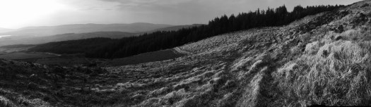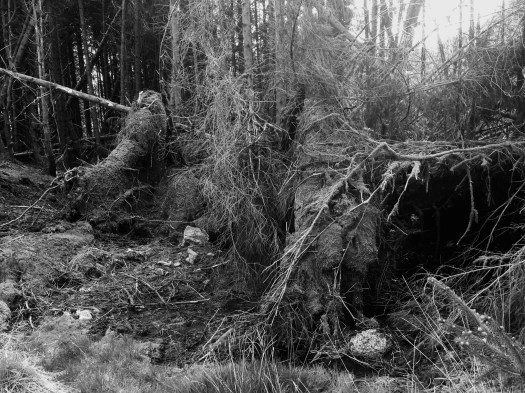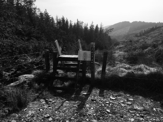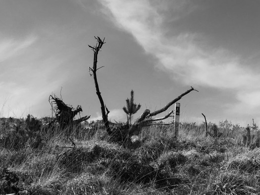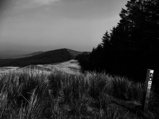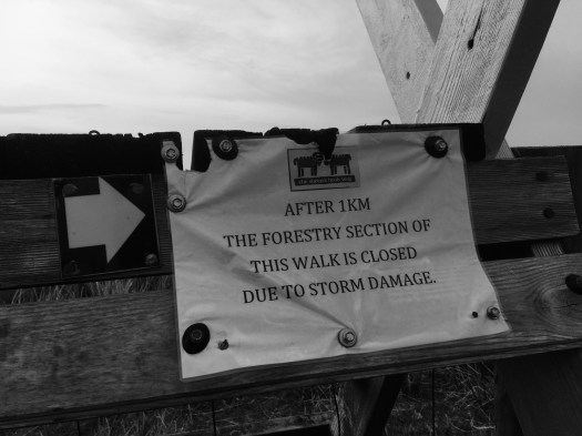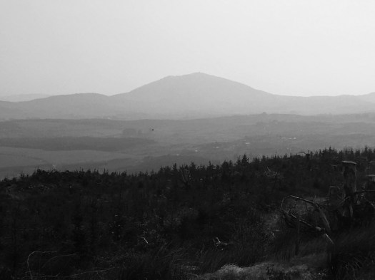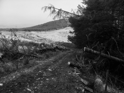 The route; road, farm track through fields up to the first peak the west following a way marked trail, down to forestry road, the up to Sitka forest, from here there was a trail which is now closed due to fallen storm damaged trees, the section closed, before joining the last section through more fields, sheep grazing land. I took note of the trail closed signs but continued anyway.