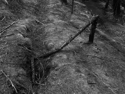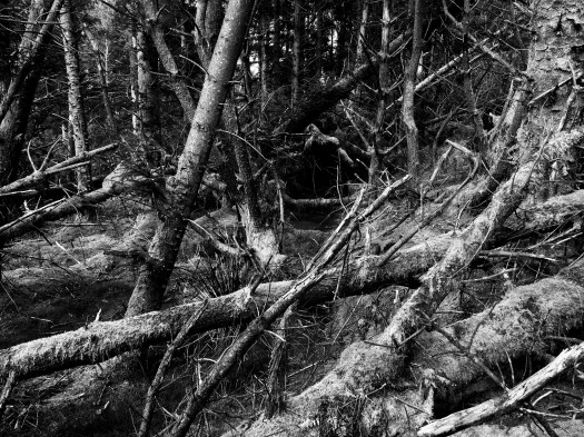 Navigating the fallen trees away from any path, I headed further away from where I wanted to be with the hour of sunlight left, I thought about setting up camp for the night. Going forward was slow, at times it to a few minutes to find a way through the lattice of branches. Each time, go back, go up, go down, the path was low, a trail would appear. Follow the animals, they know. This for two hours or so. Eventually there was more sky ahead than tree line. Eventually there was a field and a fence.