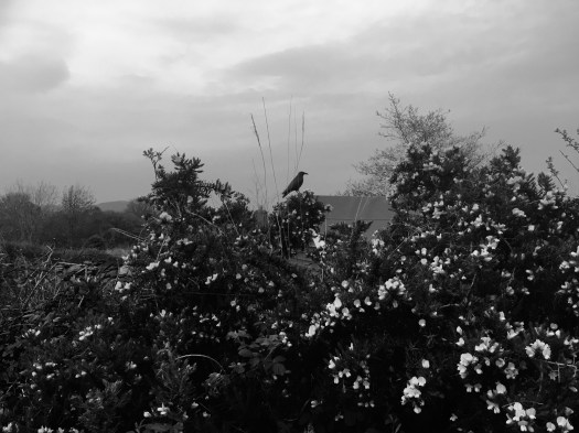 The crow took off as I reached the final slope down to the road. Now two hours from home. As I passed the first of the houses, tired, watching the road beneath my feet, I stopped suddenly. In my periphery I saw the crow. Perched on a shed roof. I couldn’t believe it. I stopped and looked over. It didn’t move.